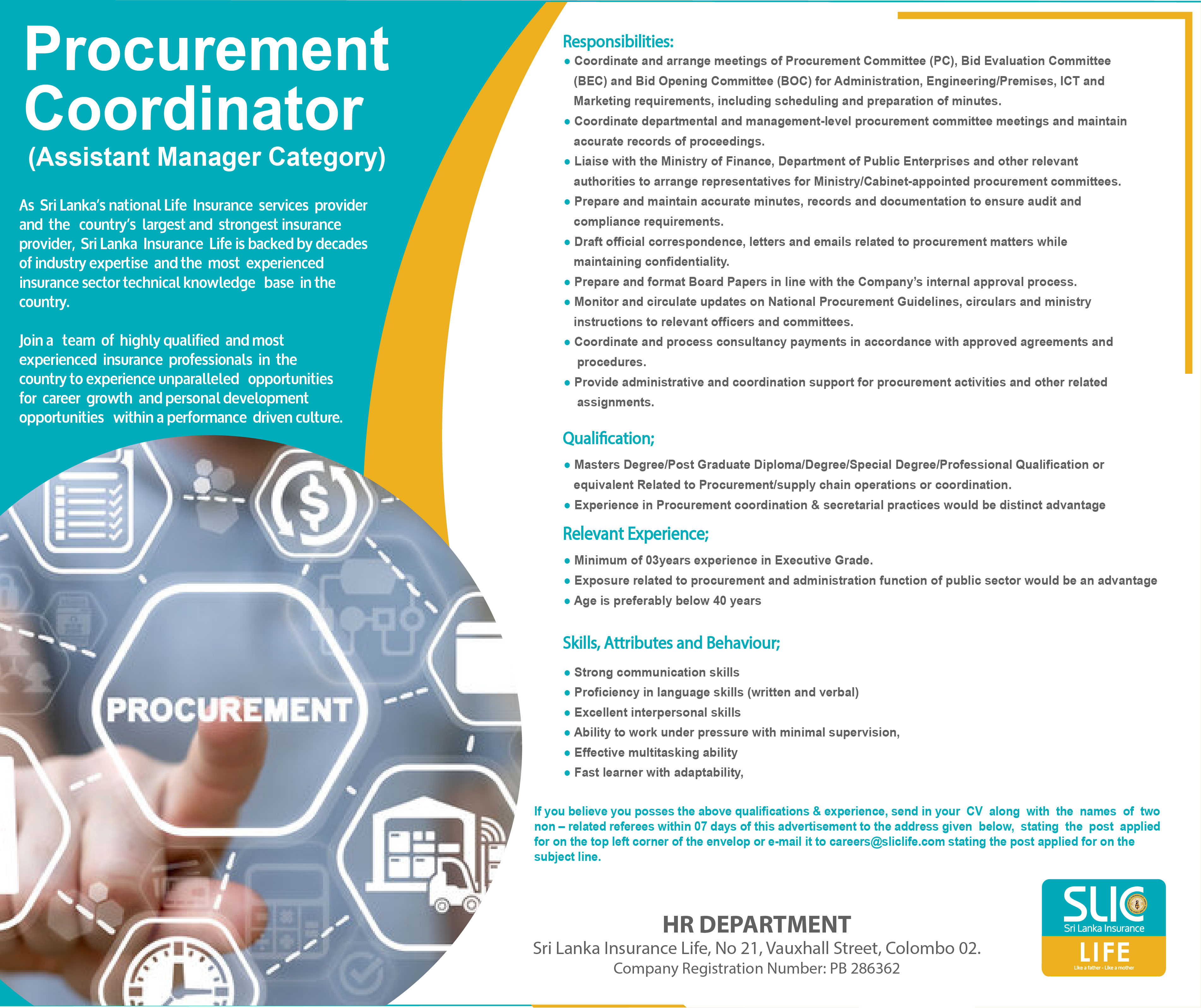 If you believe you posses the above qualifications & experience, send in your CV along with the names of two non-related referees within 07 days of this advertisement to the address given below, stating the post applied for on the top left corner of the envelop or e-mail it to careers@sliclife.com stating the post applied for on the subject line.